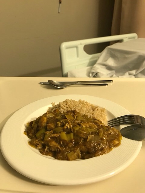 hurry back to my room closing the door so the whole floor doesnât get to experience a curry smell. Â Uh oh, didnât work, here comes Kellie, the nurse, to find out where that gorgeous aroma is emanating from. Â With bowl in hand and spoon half way to my mouth, I canât deny itâs me but sorry, no spare portion.
