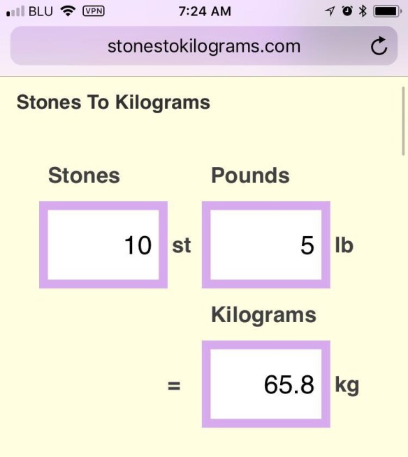 A beautiful sunny Thursday β and I weigh in for my quest to lose the 3 kgs I have gained since my hip operation.Β The scales we have to hand are actually in stones and lbs (Iβll have to do the conversion on line as I have no idea what that reading means). 10 stone 6 lbs is equal to 66.2 kgs β see below.